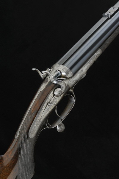 E. M. REILLY & CO. A .500 (3-INCH) HAMMER RIFLE, NO. 20674 28-inch barrels with broad machined rib, folding leaf sight to 300, the rounded frame, non-rebounding back locks, bolted hammers and rotary underlever with fine scroll engraving, 14-inch figured stock with pistol grip and steel butt plate, sling eyes, 9lb. 4oz., black powder proof, in its maker's canvas case S58 |