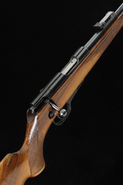 23 1 /2-inch barrel with ramp fore sight and tangent rear sight, bolt with crossbolt safety, detachable box magazine, the half length stock with pistol grip, cheekpiece and maker's butt plate, 14-inch pull, 6lb. 4oz., German nitro proof