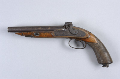 G. GIBBS A PERCUSSION DOUBLE-BARREL PISTOL 6 1/2-inch damascus twist barrels with platinum plugs, approximately 32-bore, the locks and hammers with scroll engraving, the three-quarter length stock with pistol grip, hammer spurs broken, heavily rusted and worn overall; together with a Diana model 22 air rifle (2) |