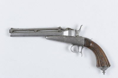 A SCARCE 9MM COLETTE-SYSTEM GRAVITY-FED REPEATING TARGET PISTOL, NO. VC1700 8 1/2-inch octagonal barrel with full length gravity-fed magazine, rising breech, the central hammer with safety bar, the frame with fine scroll engraving and fluted walnut grip S58 |