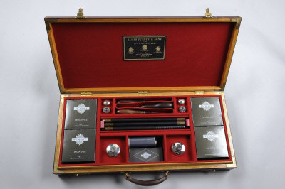 JAMES PURDEY & SONS AN OAK AND LEATHER CASED SHOTGUN CLEANING KIT suitable for a 12-bore gun, the case fitted with Purdey cleaning rod, 12-bore snap caps, oil bottles, turnscrews and striker disc key |