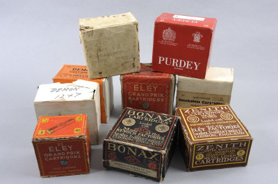 including: 12-bore Eley "Zenith", H. Adkin & Sons "Demon", Purdey, Kynoch War-time issue, Eley's Gastight and 28-bore Eley "Grand Prix"; together with 2 empty boxes, Kynoch "Bonax" with an ironmonger's retail label and Eley "Grand Prix" (9)