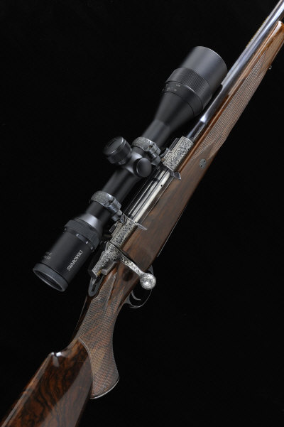 JOHN RIGBY & CO. A .300 HUNT-ENGRAVED WIN MAG BOLT-ACTION SPORTING RIFLE, NO. 6905 26-inch barrel signed by the maker in gold, the receiver profusely engraved in relief with foliate scrollwork and mounted with a Swarovski 4-16x50 telescopic sight, bolt with side safety, the hinged base plate further engraved with the calibre and a scene of a gold waiting leopard, signed by the engraver "M. A. Hunt", recoil stud, the half length highly figured stock with pistol grip, cheekpiece and rubber recoil pad, 10lb. 15oz., nitro proof, in its full length mock-crocodile case with maker's accessories S1 |