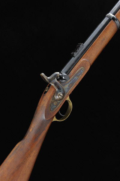 PARKER HALE A MODERN REPRODUCTION .577 ENFIELD TWO-BAND CARBINE, NO. 1338 23-inch barrel with adjustable ladder rear sight and bayonet bar, the hammer and block with PH crown and retaining all of its original hardening colour, the three quarter length stock with brass furniture, 14-inch pull, sling swivels, 6lb. 14oz., black powder proof S1 |