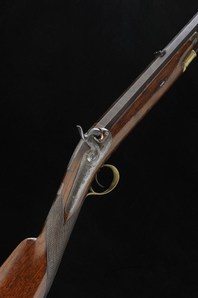 W. & J. RIGBY AN 18-BORE PERCUSSION SPORTING RIFLE, NO. 10432 31-inch heavy octagonal damascus barrel with micro groove type rifling, folding leaf sight to 150, engraved breech with platinum plate, the lock and hammer with scroll engraving, the half length figured stock with engraved brass furniture and patch box, sling eyes, 14 1/2-inch pull, walnut ram rod, 9lb. 6oz., London black powder proof S58 |