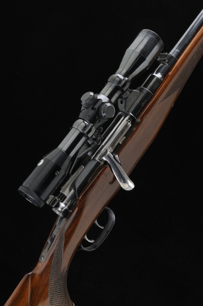 MANNLICHER SCHOENAUER A .270 BOLT-ACTION SPORTING RIFLE, NO. 57615 22-inch barrel with ramp fore sight, rear sight with folding leaves, the receiver mounted with a Nickel Marburg telescopic sight in swing-off mounts, bolt with swept back handle and flag and tang safeties, double set triggers, the half length stock with pistol grip, cheekpiece and maker's butt plate, 13 1/2-inch pull, 8lb. 9oz., Austrian nitro proof S1 |