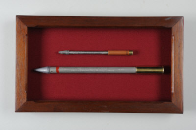 A WHALE MARKER CARTRIDGE DISPLAY BOARD the mahogany frame containing 12-bore and .410 whale tagging cartridges, 15 1/2 by 9-inches |