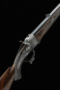 ALEX HENRY A SCARCE CASED .450 FALLING BLOCK HAMMER RIFLE, NO. 1892 30-inch barrel with Henry rifling, with raised fore sight, rear sight with folding leaves to 150, the receiver, back lock, bolted hammer and underlever with fine border and scroll engraving, the maker's name signed within a scrolling banner and retaining traces of original hardening colour, receiver ring with patent number, 14-inch highly figured stock with pistol grip and engraved steel butt plate with trap, 7lb. 9oz., black powder proof, in its full length brassbound oak and leather case, leather lined interior with maker's label and load information, the fitted compartments containing a multitude of loading accessories, numbered to the rifle, including hollow-nosed bullet mould, powder flask with patent adustable nozzle, bullet seating tool, nipple key, turnscrew, oil bottle, etc |