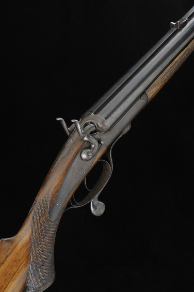 28-inch barrels with Henry rifling, file-cut rib with folding leaf sight, the rounded patent action, non-rebounding back locks, bolted hammers and rotary underlever with scroll engraving, 14 1/2-inch replacement stock with pistol grip, cheekpiece and steel butt plate, 8lb. 15oz., black powder proof