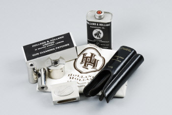 HOLLAND & HOLLAND A SILVER ENGRAVED MATCH BOX COVER together with a pair of Holland & Holland snap caps, oil bottle, hand guards, cloth, etc |
