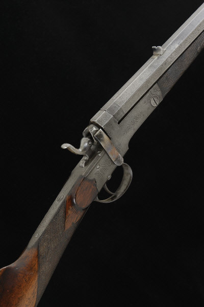 24-inch octagonal damascus barrel with machined top surface, the frame and hammer with screw breech, 14 1/2-inch stock with steel butt plate, 5lb. 6oz., black powder proof, worn overall, leather case