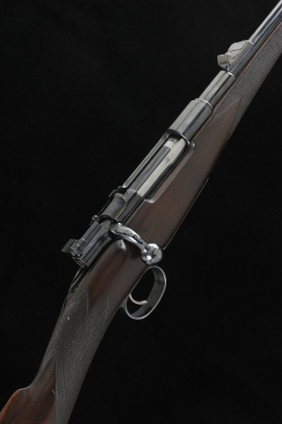 A 7X57MM BOLT-ACTION SPORTING RIFLE, NO. 4914, FINISHED IN THE LONDON TRADE 24 1/2-inch barrel with raised fore sight, rear sight with folding leaves to 300 yds, bolt with flag safety, magazine with removable base plate, the trigger guard with retailer's number 40166, half length stock with straight hand including 2-inch extension and rubber recoil pad, 14-inch pull, sling eyes, 6lb. 11oz., nitro proof S1 |