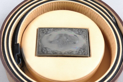 FERRUM & HIDE A FINE TALLETT-ENGRAVED BUFFALO BELT the black Sedgewick bridle leather belt with a 38mm steel buckle and clip, engraved with a Cape buffalo and signed "B. Tallett 18", retaining all of its colour hardened and bright finish, in its maker's leather case, new and unused |