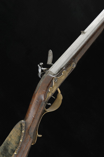 A DUTCH 12-BORE FLINTLOCK SPORTING RIFLE 40-inch round to octagonal barrel with fixed rear sight, the plain left-handed lock with roller to frizzle rim, the left-handed full length stock with engraved brass furniture, cheekpiece and nailed velvet cheek pad, 6lb. 12oz. S58 |