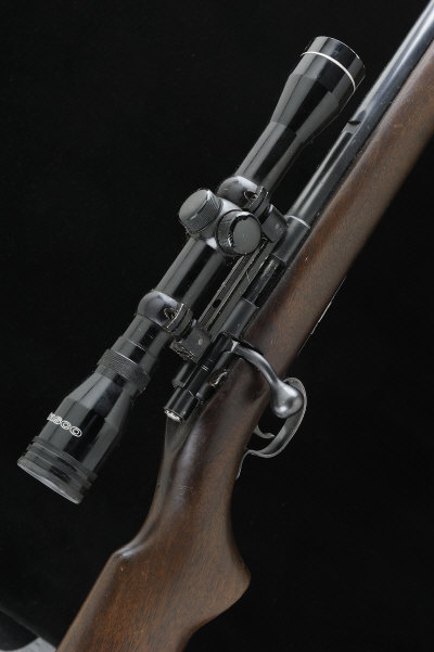 25-inch barrel with bead fore sight, rear sight removed, the receiver mounted with a Tasco telescopic sight, bolt with side safety, detachable box magazine, the half length stock with pistol grip and rubber recoil pad, sling swivels, 6lb. 10oz., nitro proof