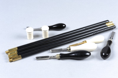 A SMALL GROUP OF GUNMAKERS ACCESSORIES comprising: ivory-handled turnscrew and striker key, 2 further striker keys and a nipple key, 2 striker pots, a Purdey named 12-bore cleaning rod and a similar unnamed 20-bore cleaning rod