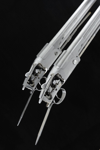 A PAIR OF 20-BORE BARRELLED ACTIONS to make a pair of single trigger over and under ejector guns, the 29 1/2-inch barrels with 2 3/4-inch chambers, about full choke borings, the semi rounded frames with top levers and trigger plate actions, Boss type fore-end irons without ejector work or extractors S2 The actions are of UK manufacture and remain in the white. |