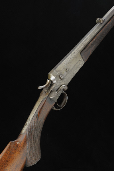 25 3/4-inch octagonal barrel with folding leaf sight, automatic ejector, the frame, central hammer and side lever with border engraving, 14 1/4-inch figured stock with pistol grip, 4lb. 14oz., black powder proof, worn overall