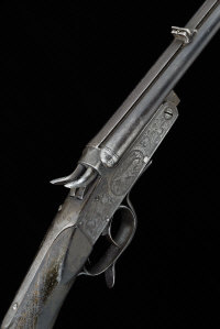 28-inch barrels with machined rib, folding leaf sight, the frame with central hammers and push forward underlever engraved with scenes of deer, 13 3/4-inch figured stock with pistol grip and cheekpiece, 5lb. 6oz., German nitro proof, fore-end wood missing, worn overall