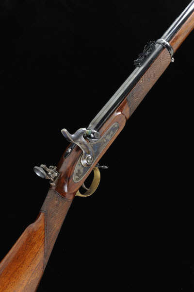 PARKER HALE A REPRODUCTION .451 VOLUNTEER TARGET RIFLE, NO. 160 32-inch barrel with adjustable rear sight and tang mounted aperture sight, the lock signed "Enfield" and spuriously dated 1858, retaining much of its original finish overall, the full length stock with brass furniture, 14-inch pull, 9lb. 2oz., black powder proof, ramrod missing S1 |