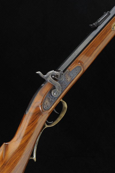 AN ITALIAN .45 REPRODUCTION PERCUSSION SPORTING RIFLE, NO. 62616 29-inch octagonal barrel with adjustable rear sight, cleaning rod, the lock and hammer with scroll decoration, the half length figured stock with cheekpiece and crescent butt plate, 14-inch pull, black powder proof S1 |