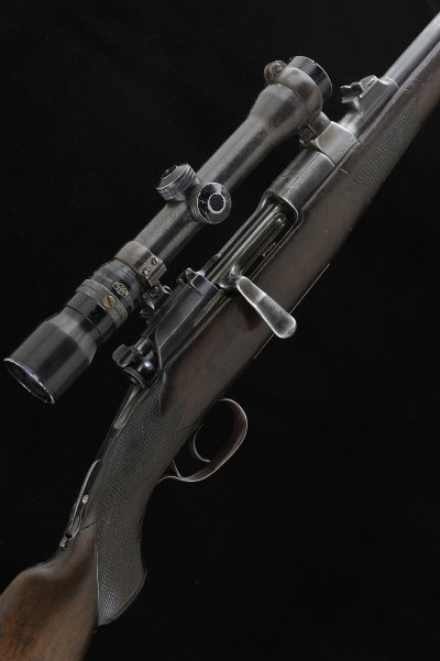 MANNLICHER SCHOENAUER A 6.5X54MM MODEL 1903 TAKE-DOWN BOLT-ACTION SPORTING RIFLE, NO. 1357 23-inch barrel with ramp fore sight, rear sight with folding leaves, the receiver mounted with a Karles Helia Super telescopic sight in claw mounts, bolt with flag safety, tang mounted with folding peep sight, the half length stock with pistol grip, cheekpiece and rubber recoil pad, cracked at the hand, 14-inch pull, sling swivels, 8lb. 6oz., nitro proof S1 |