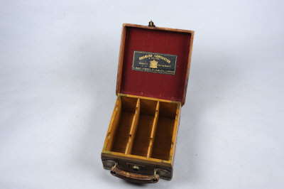 CHARLES LANCASTER A BRASSBOUND OAK AND LEATHER CARTRIDGE MAGAZINE of small size, for about 150 cases with oak dividers |