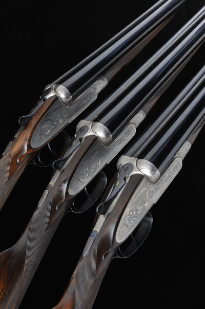 JOSEPH LANG & SON A MATCHED TRIO OF 12-BORE SIDELOCK EJECTOR GUNS, NOS. 15031, 15032 AND 15277 28-inch barrels, No.1 gun sleeved with 2 3/4-inch chambers about 1/2 choke borings, No.2 gun with replacement chopper-lump barrels by the maker with 2 1/2-inch chambers about 1/4 and 1/2 choke borings, No.3 gun with 2 1/2-inch chambers about 1/4 and 1/2 choke borings, the frames, hand detachable locks and gold numbered top levers with fine bouquet and scroll engraving, gold lined cocking indicators, No.1 gun with 14 1/4-inch well figured stock including 1/2-inch extension, No.2 gun with 15-inch well figured stock including 1 1/4-inch extension, No.3 gun with 15 3/4-inch figured stock including 1-inch extension, 6lb. 11oz., 6lb. 11oz. and 6lb. 9oz. respectively, nitro proof, in three individual canvas gun cases S2 The maker confirms that the pair were built in 1911 and the No.3 gun was built to match in 1920. |