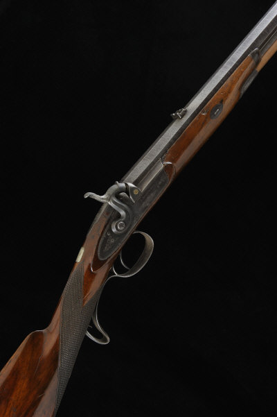 S. BOOTH & CO. A .577 PERCUSSION SPORTING RIFLE 32-inch octagonal damascus barrel, the top surface with folding leaf sight and engraved 'London', ramrod, the lock and hammer with border and scroll engraving, hammer spur replaced, set trigger, the half length figured stock with sling eyes and engraved steel furniture, 14-inch pull, 6lb. 6oz., black powder proof S58 |