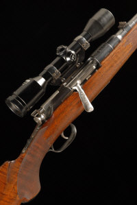 STEYR MANNLICHER A .308 MODEL GK BOLT ACTION SPORTING RIFLE, NO. 48076 23 1/2-inch barrel with ramp foresight, rearsight with folding leaf, the receiver with side mount containing a Zeiss Diatal 4x32 telescopic sight, bolt with flag safety, tang with sliding safety, magazine base plate engraved with scrollwork and scenes of deer, double set triggers, rear trigger broken, the half length well figured stock with pistol grip and cheek piece, 13 3/4-inch pull, 9lb., Austrian nitro proof |