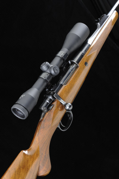 CHARLES LANCASTER A .270 BOLT-ACTION SPORTING RIFLE, NO. 14686 24-inch barrel with ramp fore sight and folding leaf sights on a raised bed, the receiver mounted with a Simmons telescopic sight, quick detachable Holland & Holland dial mounts, bolt with sliding side safety, magazine with hinged base plate with details inlaid in gold, recoil stud, half length well figured stock with pistol grip, cheekpiece and rubber recoil pad, sling eyes, 7lb. 8oz., nitro proof