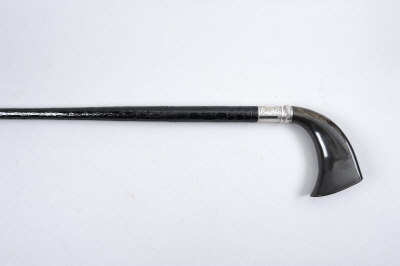 JOHN WILSON A .410 WALKING STICK GUN, RETAILED BY BRIGG, LONDON 25-inch barrel covered in mock crocodile skin leather, engraved escutcheon twisting to reveal the folding spur trigger, horn handle, nitro proof S5 This lot will not be available for viewing in London. It can be viewed by appointment at our office in West Sussex. |
