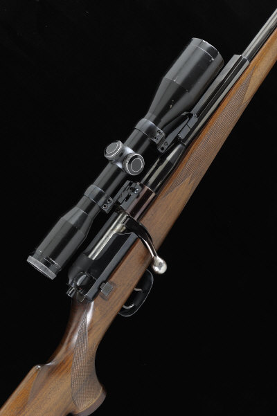 23 1/2-inch barrel mounted with a Swarovski Habicht-6 telescopic sight on quick detachable mounts, interchangeable barrel of the same length and fitted with bases for the same scope, bolt with side safety, double set triggers, the half length stock with pistol grip, cheekpiece and rubber recoil pad, 15-inch pull, 9lb. 2oz., German nitro proof
