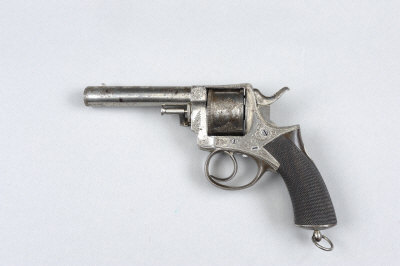 R. J. JEFFERY A .455 "RIC" MODEL PRESENTATION REVOLVER 4 3/4-inch barrel, the frame and cylinder with scroll engraving and engraved with the retailer's name, 'R. Jeffery, Guildford', loading gate, chequered walnut grip with silver escutcheon, lanyard loop, black powder proof S5 The revolver is of Webley RIC pattern and appears devoid of a serial number.