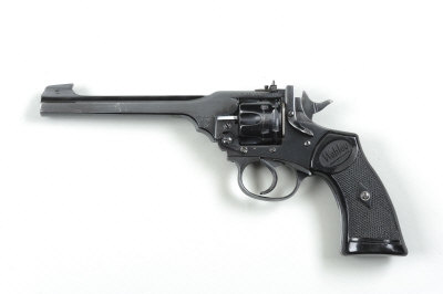 WEBLEY & SCOTT A .22 MARK IV REVOLVER, NO. B16996 6-inch barrel with adjustable rear sight and impressed winged bullet trademark, stirrup catch, chequered composition grips, nitro proof S5 |