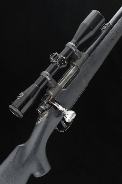 18 1/2-inch barrel threaded for a sound moderator, the receiver mounted with a Schmidt & Bender 6x42 telescopic sight, black composition stock with pistol grip and recoil pad, 14-inch pull, 8lb. 2oz., nitro proof