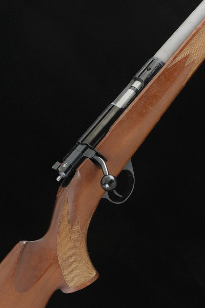 18-inch replacement barrel threaded for a sound moderator, the receiver with dove tail grooves, bolt with flag safety, magazine missing, half length stock with pistol grip and maker's butt plate, 14 1/4-inch pull, 7lb., nitro proof