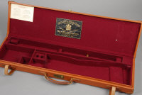 HOLLAND & HOLLAND A LIGHTWEIGHT LEATHER GUN CASE with compartment blocked for 28-inch barrels, the lid embossed Russell Barnett Aitken; together with an E. Whistler & Co. canvas gun case |