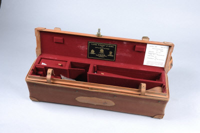 J. PURDEY & SONS A LIGHTWEIGHT LEATHER MOTOR CASE suitable for a .300 double barrel rifle, with compartment for 24-inch barrels, the charge card numbered to gun 29181, in its canvas outer cover |