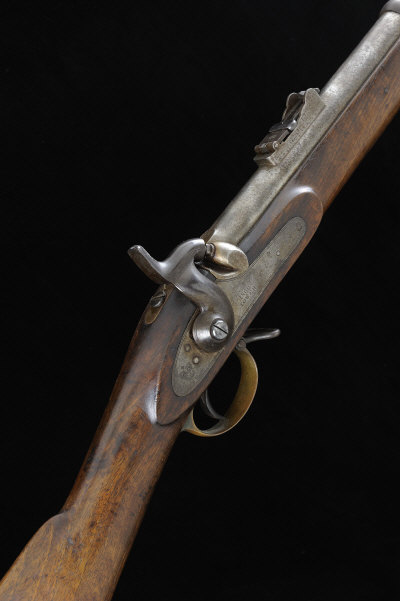 TOWER A .577 TWO-BAND ENFIELD PERCUSSION CARBINE 24-inch barrel with adjustable ladder rear sight, ramrod and two barrel bands, the lock with border engraving with crowned 'VR' and dated 1860, the three quarter length figured stock with brass furniture, 14-inch pull, 7lb. 8oz. S58 |