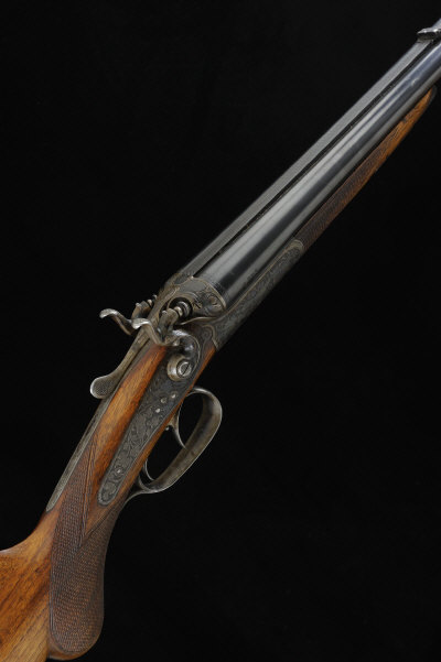 A GERMAN 10.5MM HAMMER RIFLE, NO. 6060 27 1/2-inch barrels with machined rib and doll's head extension, rear sight with folding leaf, the rounded frame, rebounding hammers, backlocks and top lever with scenes of dogs and game in relief amongst scrolling foliage, retaining much of its original hardening colour, 14-inch figured stock with pistol grip, cheekpiece and ribbed butt plate, 7lb. 10oz., German nitro proof S1 Country of Origin: Germany/Date of Manufacture: circa 1900 |
