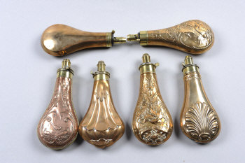 SIX COPPER POWDER FLASKS