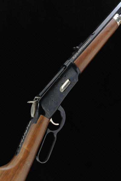 20-inch octagonal barrel with adjustable rear sight, full length magazine tube, the receiver with commemorative decoration and saddle ring, 13 1/2-inch stock with crescent butt plate and commemorative medallion, 7lb. 1oz., nitro proof