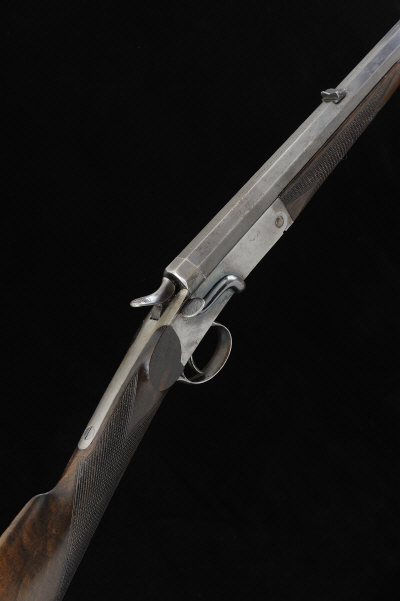 26-inch octagonal barrel with folding leaf sight and replacement fore sight, the plain frame with side lever and central hammer, 15-inch stock including 1-inch ebonite extension, 6lb. 2oz., black powder proof