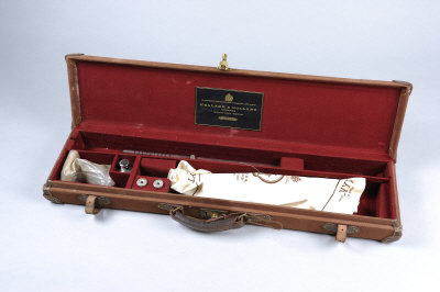 HOLLAND & HOLLAND A LIGHTWEIGHT CANVAS GUN CASE with compartment for 28-inch barrels; together with a leather leg-of-mutton case (2) |