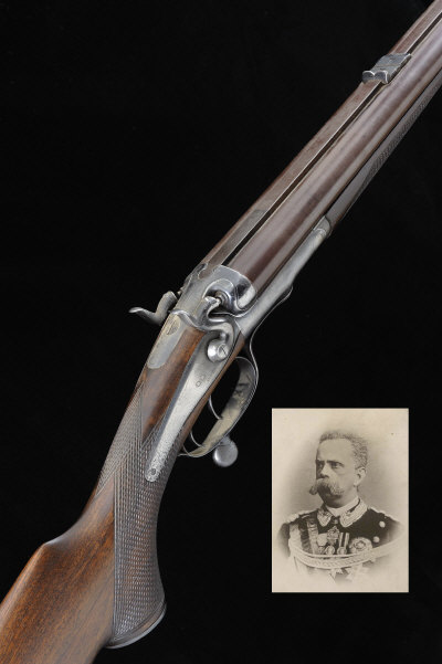 HOLLAND & HOLLAND A .577 HAMMER RIFLE, NO. 7687, BUILT FOR THE KING OF ITALY 25 3/4-inch damascus barrels with slightly raised fore sight, rear sight with folding leaves, the broad rib with doll's head extension, the frame, rebounding back locks, hammers and rotary underlever with border engraving and numbered 1 on the top strap, 14-inch replacement stock with pistol grip, 8lb. 12oz., black powder proof, together with a set of reloading dies and some new brass cases