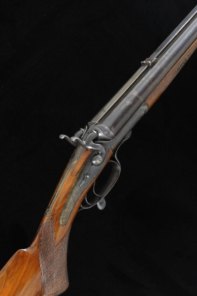 JOHN LYELL A .500 HAMMER RIFLE, NO. 1540 26-inch barrels with full length rib and folding leaf sight, the rounded frame, non-rebounding back locks, bolted hammers and rotary underlever with scroll engraving, the maker's name signed within a scrolling banner, 14 1/4-inch figured replacement stock and fore-end wood, with pistol grip, cheekpiece and steel butt plate, 9lb. 4oz., black powder proof |