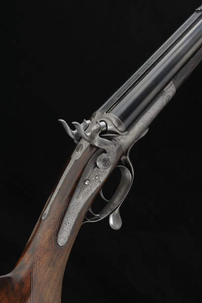 JOHN RIGBY & CO. A .500 (3-INCH) HAMMER RIFLE, NO. 13545 26-inch barrels with file-cut rib, folding leaf sight to 250, the rounded frame, non-rebounding bolted hammers, locks and rotary underlever with scroll engraving, 15-inch well figured replacement stock with pistol grip, cheekpiece and engraved heel and toe plates, sling eyes, 9lb. 10oz., in its re-lined oak and leather case with accessories and reproduction label S58 The maker confirms that the rifle was built in 1870. |