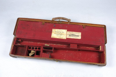 BOSS & CO. A LIGHTWEIGHT LEATHER DOUBLE MOTOR CASE with compartments blocked for 29-inch barrels, interior mothed, worn overall |