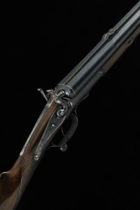 28-inch barrels with broad rib and folding leaf sight, the frame, back locks and bolstered hammers with scroll engraving, 14-inch replacement stock and fore-end, 8lb. 11oz., black powder proof, worn and refinished overall with numerous repairs and alterations